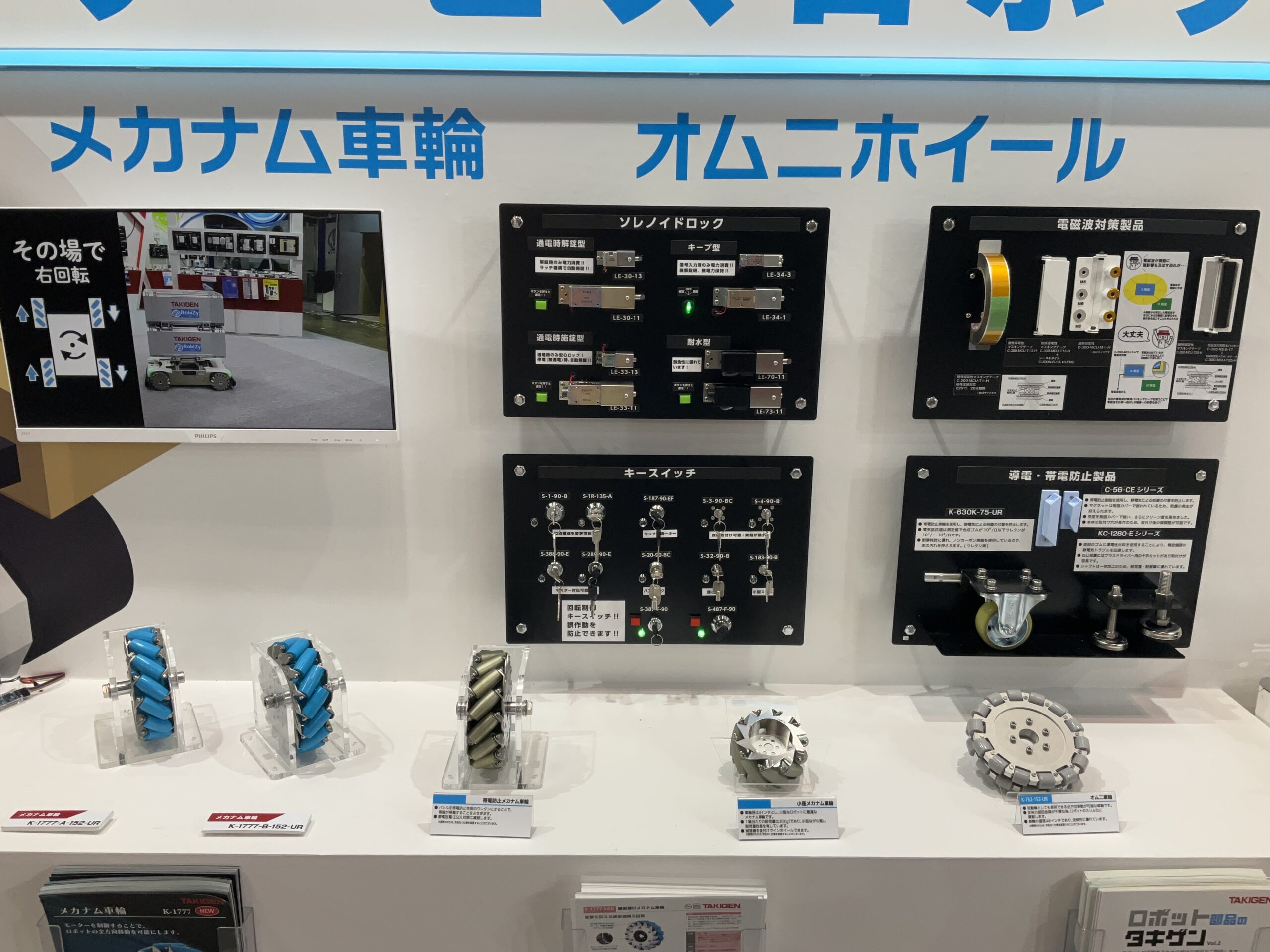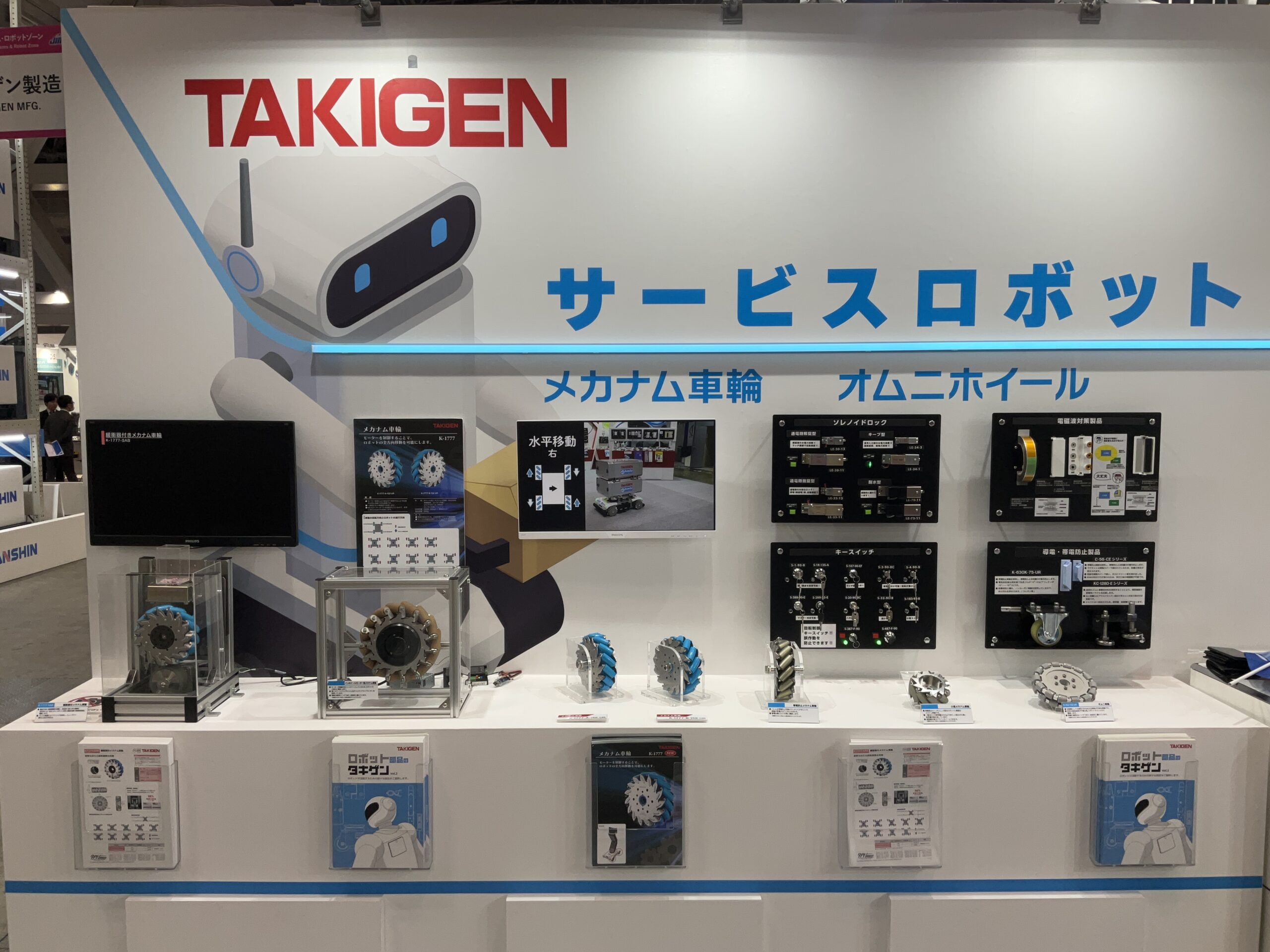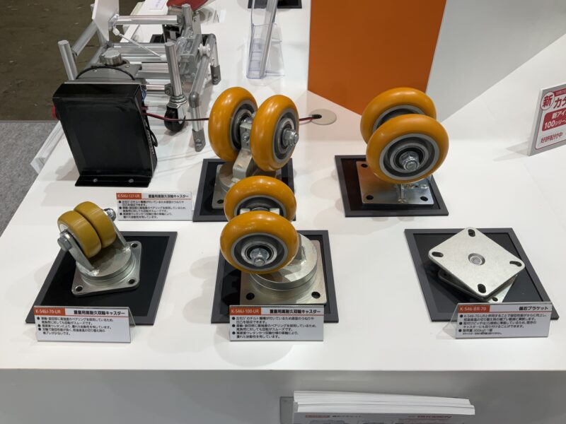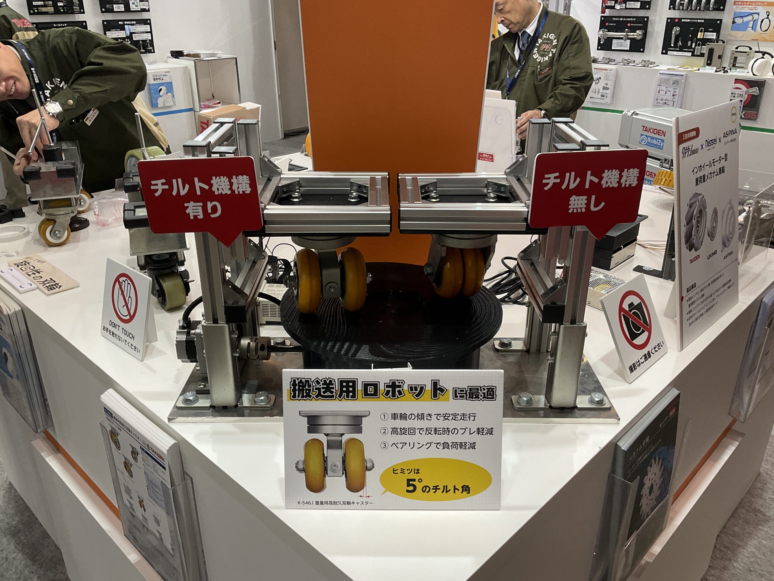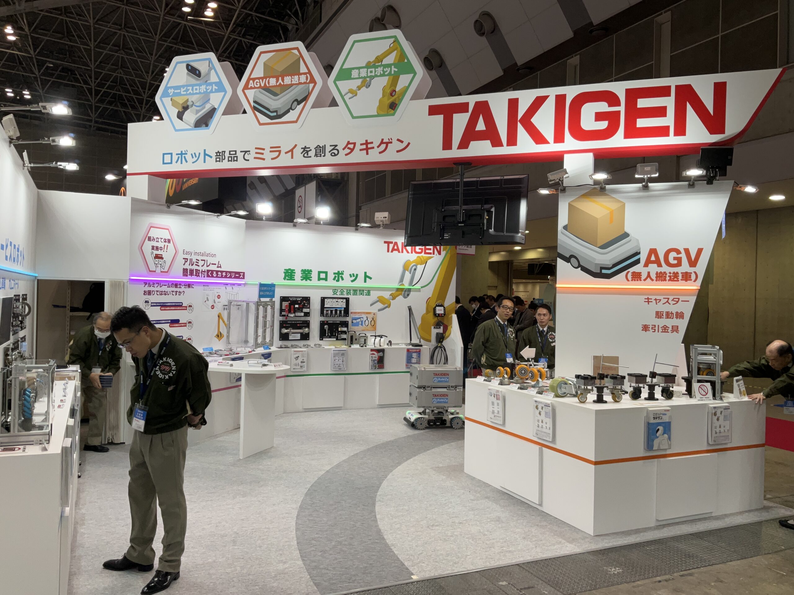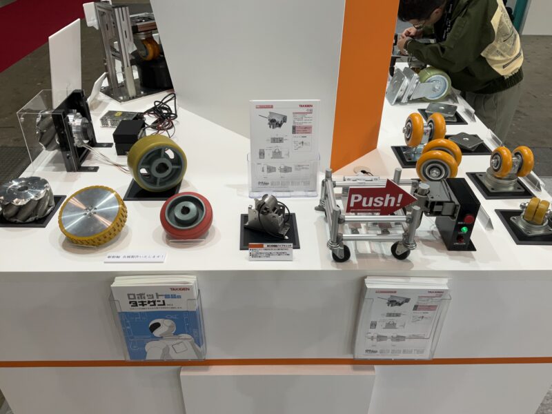 搬送用ロボット向けに車輪がチルトする【重量用高耐久双輪キャスター】、アルミフレームの設計・組立を省力化する【くるカチシリーズ】、サービスロボット向けに全方位移動可能な駆動輪【メカナム車輪】など、現場ニーズに応える製品を出展中です。皆さまお誘い合わせの上、ぜひタキゲンブースにご来場ください。