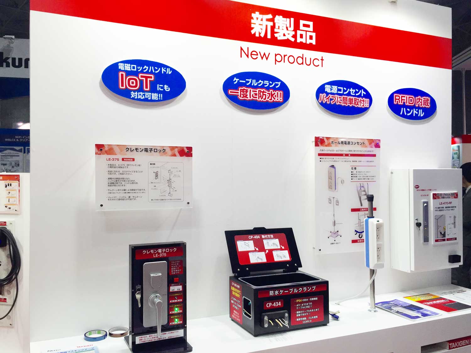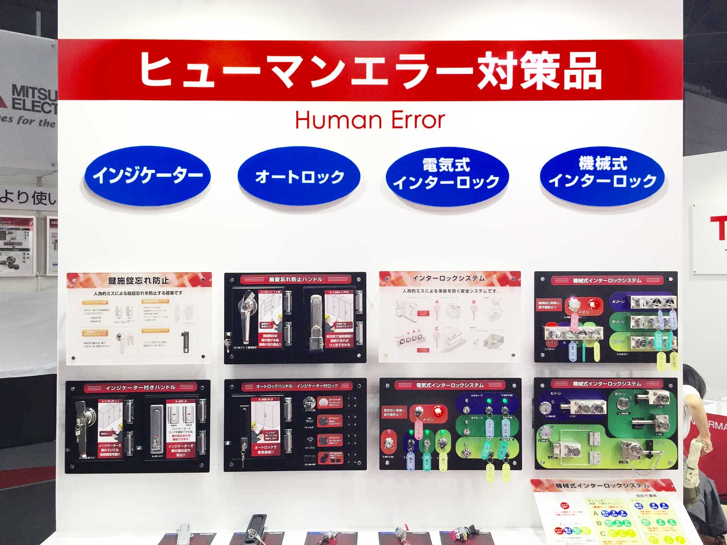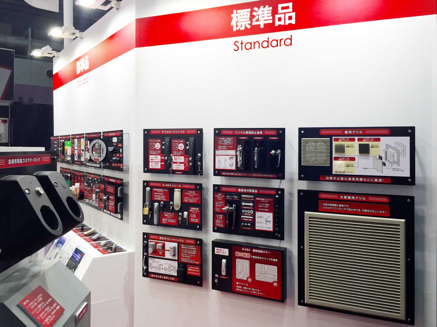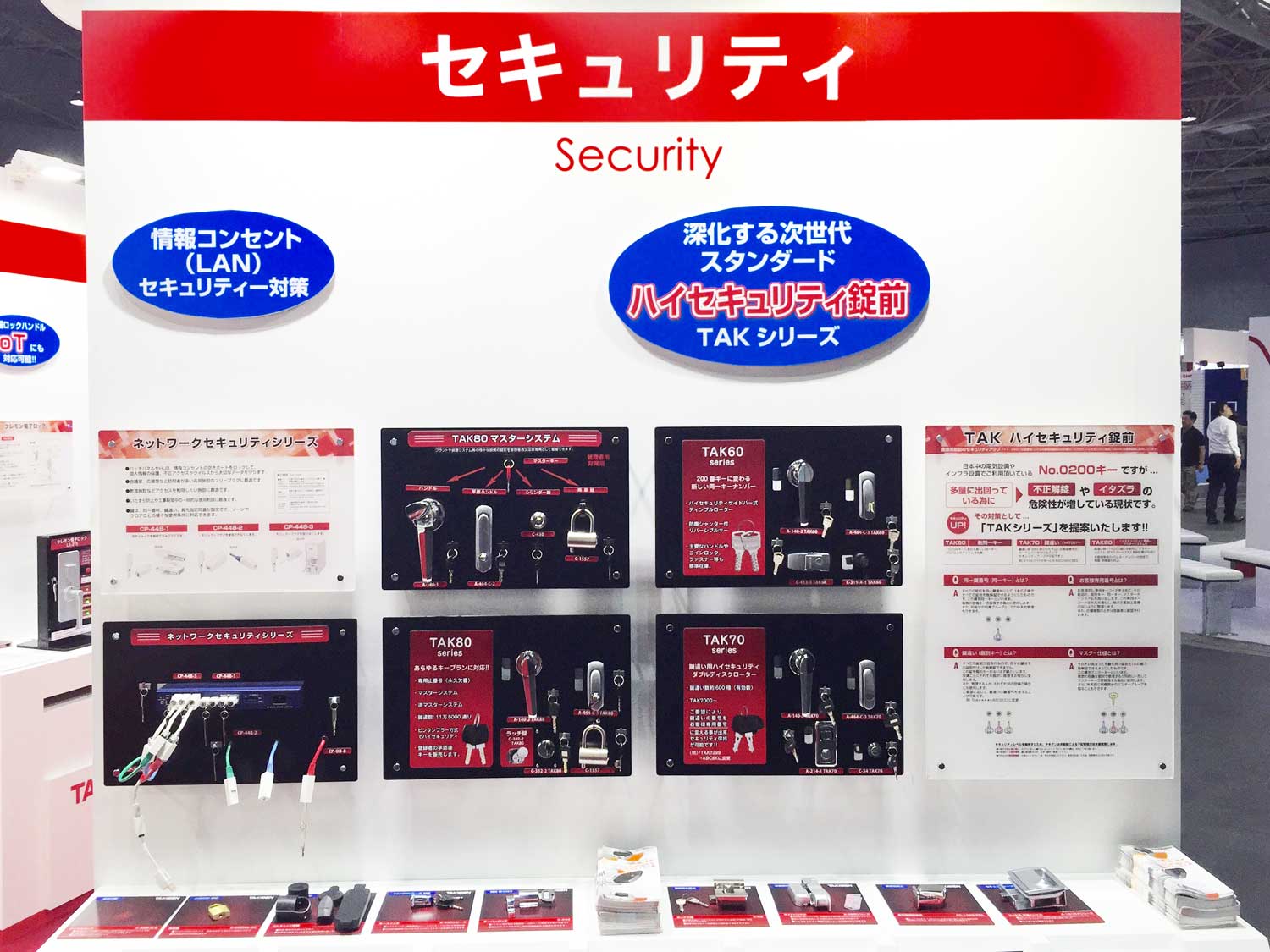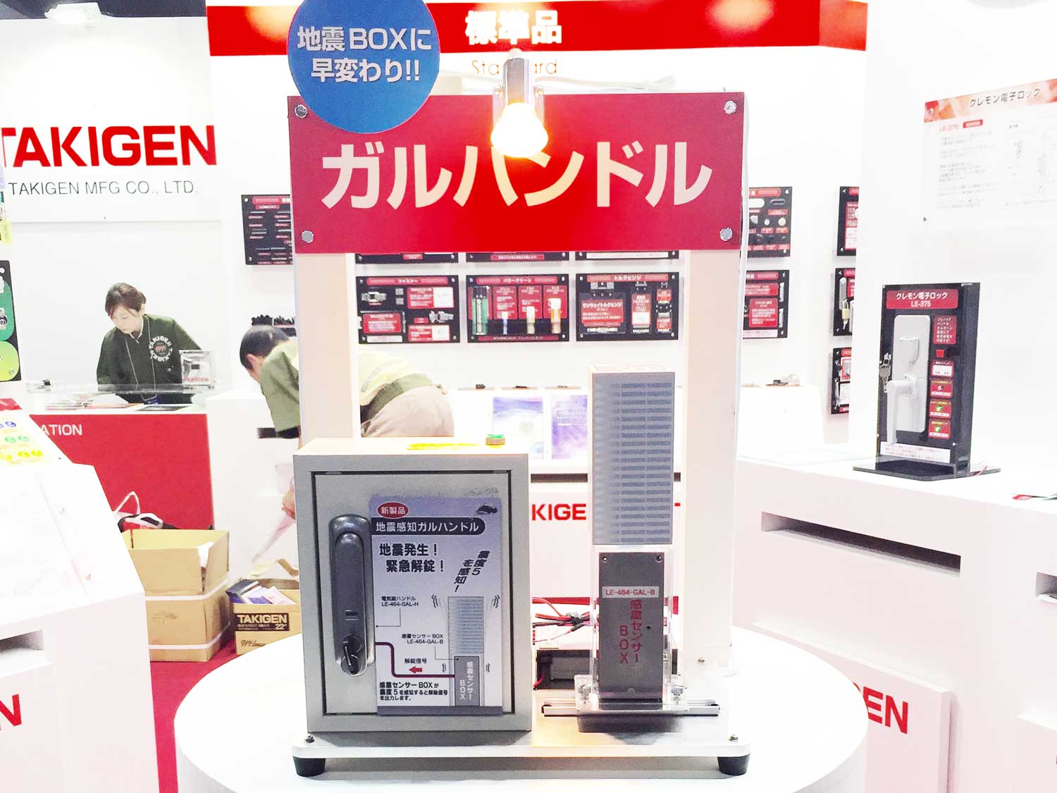 主な展示品は「地震感知ガルハンドル」、ハイセキュリティ錠前「TAKシリーズ」。また、鍵の閉め忘れなどのヒューマンエラーを防止する「インジケーター搭載製品」、取付け簡単「充電器コネクタホルダー」、さらに汚れが目立たなく高級感のある「TMP(テンプ)処理製品」を出展します。その他、新製品も数多くご紹介させていただきます。