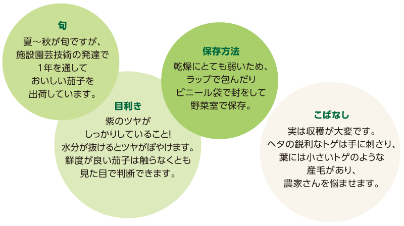 茄子はカリウムや食物繊維が豊富です。皮に含まれるナスニンには抗酸化作用があり、アンチエイジングなどの効果があります。